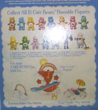 A rather poor shot, this shows the 1st series backer of the Care Bear poseable series. 2nd series consisted of the Cousins and other bears like Share bear and friends. You can also see the Loe-A-Lot playset and 2 Cloud Cars!