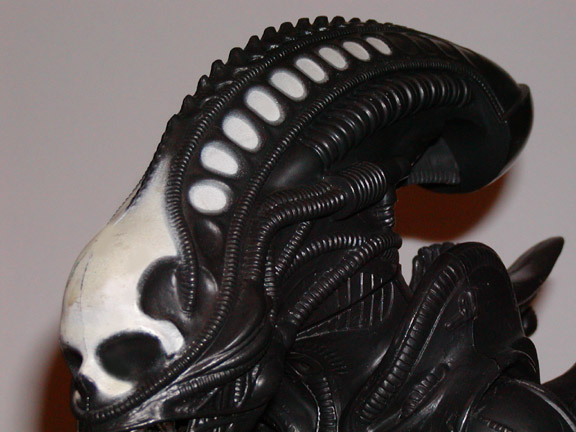This piece stands 12" inches and is poseable in the arms, wrists, legs and tail. It comes with such features as a removable dome, glow in the dark paint on his head. The greatest feature was he mouth openning and two silver inner jaws jabbing forth.