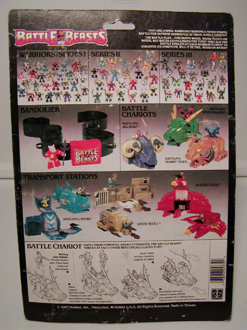 The Deer Stalker is the Chariot of choice for "Wood". It has the pullback feature as well as the chomping jaws when it moves. Two side bars can be lifted up on each side to carry two more Battle Beasts into Battle.