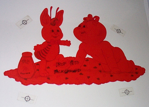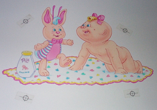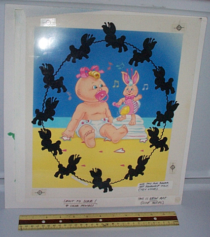 | This piece is 13" 3/4 x 14" 3/4. The picture is of a baby CPK getting his/her diaper changed by a CPK bunny. The red overlay is on on a cel that is aligned to the color artwork. |