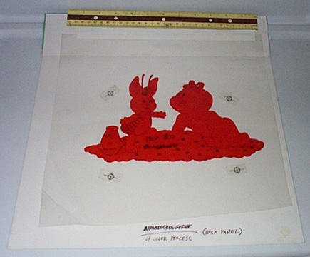 | The above piece is 14" 1/2 x 13" 3/4. The piece says it was to be used for a side panel of furniture. The black bunny like shadows are on a cel that is aligned to the color artwork. |