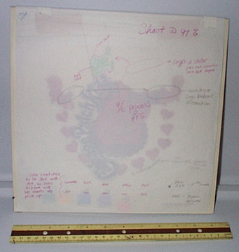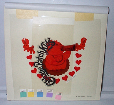 | This piece is 11" x 11" 1/2. This is a extremely nice piece. The front has a tracing paper with a little color tracing of the logo in color, and many side notes of color swatchesand size information. This piece is also dated 1990. When this tracing paper is lifted, there are two cels. The first cel has the Cabbag Patch Logo in black (later to be positioned above the piece). There also is a red shadowing like the others that only covers the art. Also shown on the cel with the red shadowing is the actual color swatches and names to be used. Then of course, lastly is the actual artwork which is extremely color full and grand. This piece may have been the logo piece appeared on all the furniture produced. |