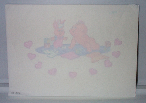 | This piece is 8" 1/4 x 11" 1/2. The picture is of a baby CPK playing with a CPK bunny. There is only a tracing paper over the art with some size numbers on it. |