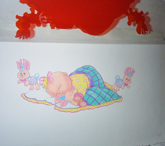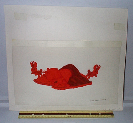 | This piece is 13" 1/2 x 14". The picture is of a baby CPK sleeping while holding a bunny, and while to others float around. The red overlay is on on a cel that is aligned to the color artwork. |