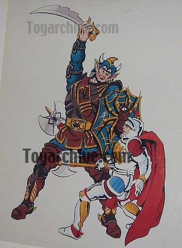 These Art Presentation Boards stand over a foot tall or more. These were probably used to finalize the artwork that would be used for the 2nd Series of the AD&D line. These are not the original pieces of art but high quailty reproductions that LJN created and sent overseas to their European company. A lot of this art you have seen before, while others you have not. For the first time collectors and fans can see the original package artwork for Pulverye and Valkeer, as well as the previously unknonw Weapons Pack! |