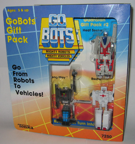 Tonka produced at least 8 GoBots 3-Packs. These 3-Packs are quite tough to find and were released all over North America. There seems to be 4 Renegade and 4 Gurdians packs. There can be more, and we are always looking.