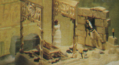 Action Features: This small playset is loads of fun. You can actually look through the red plastic of the Staff of Ra and look for the exact area were the Ark is hidden. With the naked eye, their various choices marked with heiroglyphics, but nly one can be seen through the Staff of Ra. Also included was a Indy Action Figure.