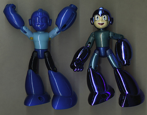 These are two Test Shots of War Machine and Mega Man from the Street Fighters 2-Pack. The figures came in their bubble, and have markings. The figures themselves are made of a different color plastic than the produced versions.