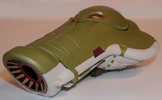 This is the Predator Ship from the Galoob Action Fleet series. This piece is extrordinary with it's detail and painting. This prototype is made of Cold Cast Resin and is hand painted. This piece was probably used for Toy Fare and catalog shoots and as usual looks better than the produced one. The toy is different than the produced one in that the main window is not see through and there are probably other differences, but I don't own the produced one to check up on.
