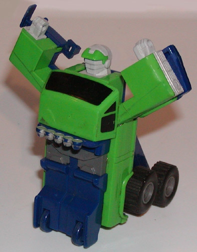 Estrela continuing to be cheap, bring us Bat-Robo! These toys are actually partially cool and colorful. They have a pullback action adn when they hit a wall, they transform and roll back to you. These would be a great hit with collectors except for one thing, we've seen them before! They were released in American by Tonka and were called Powertrons. Before Powertrons, they were created by Fujisho and released in Japan. Here is a boxed one. Pic. All be it though, these colors are unqiue to Estrela and the Transformers line. Estrela was also rather cool in making the Pick-Up in 2 of the four Mini-Car colors, including Spooky! |
