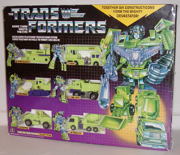 This is the Decepticon Constructicon Combiner Devastator. He is somewhat common of all the giftsets released in North America. The set does contain all 6 Constructicons and the styrofoam only hold the robots, not the weapons. The back of the box also only has Devastator's tech spec, not the other Constructicons. Here is Devastator MIB in a American style box. Variations: None.