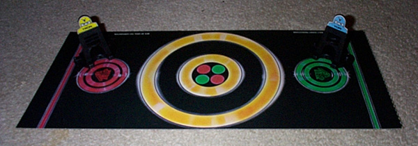 There are two games for this board. One is Arena, which is where the two characters on opposite ends for their discs at the center in attempt to knock the discs out of the center circle. Each disc in the center is one of two colors and their are four discs. Whoever knocks out the opponents discs wins. You can choose from Tron, Sark, Yuri and Dumont. The other game is titled "Sark's Solo Challenge". This game is roughly shuffle board.
