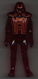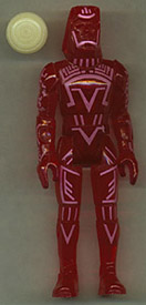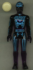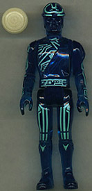 Tomy produced in 1982 four figures for the Tron series. The Three main character figures, Tron , Sark & Flynn only came with the glow-in-the dark discs. This discs were quite small and are often lost. The discs could also fit in the back of the action figure, just like in the movie. The Warrior came with a staff which also glows-in-the dark. The picture above does not show the staff for the Warrior. The staff is toughest to find of the weapons and I still need one.